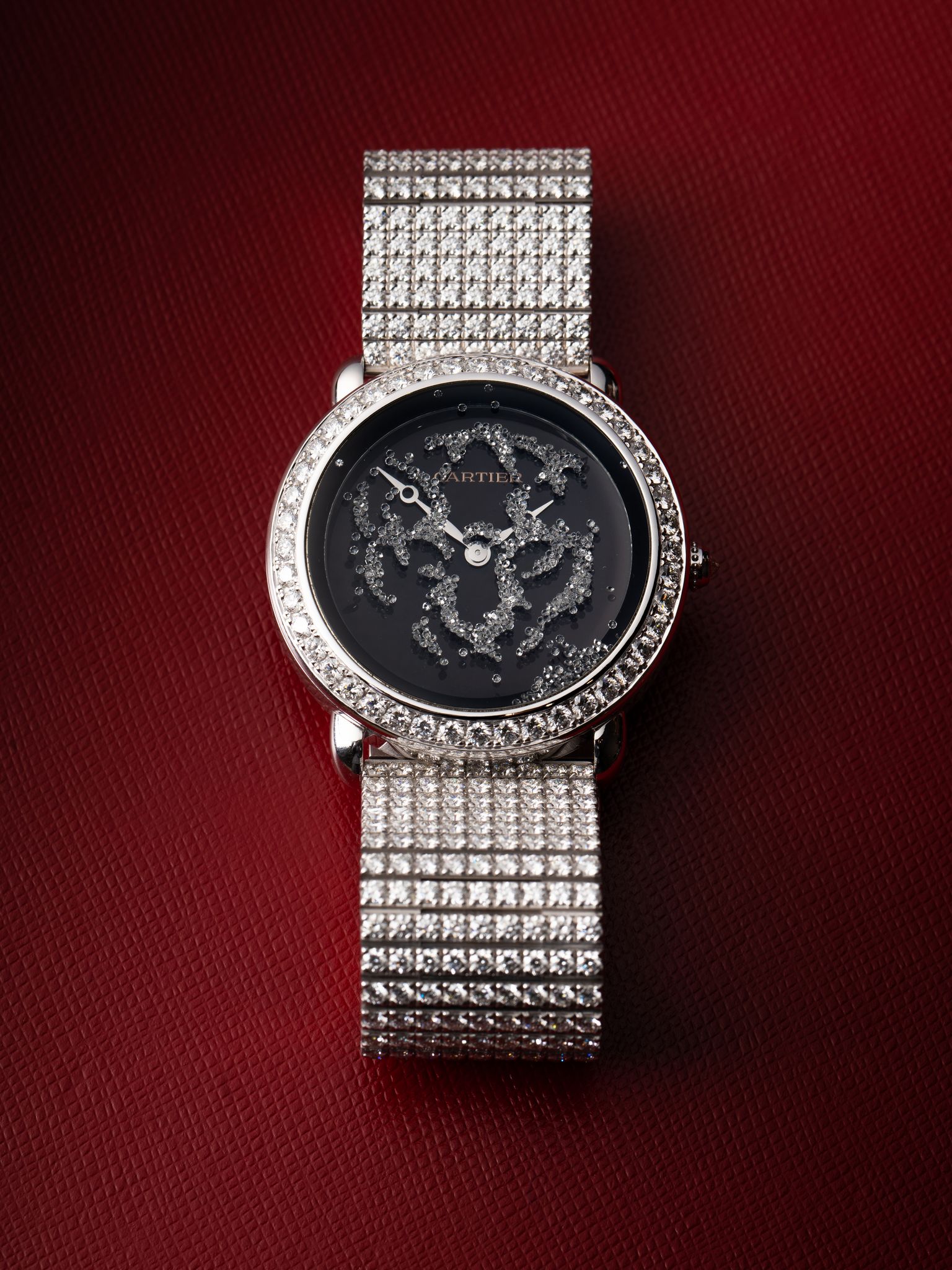 For this watch, Cartier used the Ronde Louis Cartier as a base. This luxury Cartier replica watches with diamonds bezel was initially introduced around 1937 and is quite special as it is round, while Cartier already made a name for itself in the first half of the 20th century as a maker of form-shaped watches. For the Révélation d’Une Panthère, they fitted the Ronde Louis Cartier with a double sapphire crystal which in between is filled with a patented liquid. In this liquid 650 small diamonds float, which move through invisible channels as you tilt the watch. As a result, you briefly see the head of a panther appear, outlined by the diamonds.